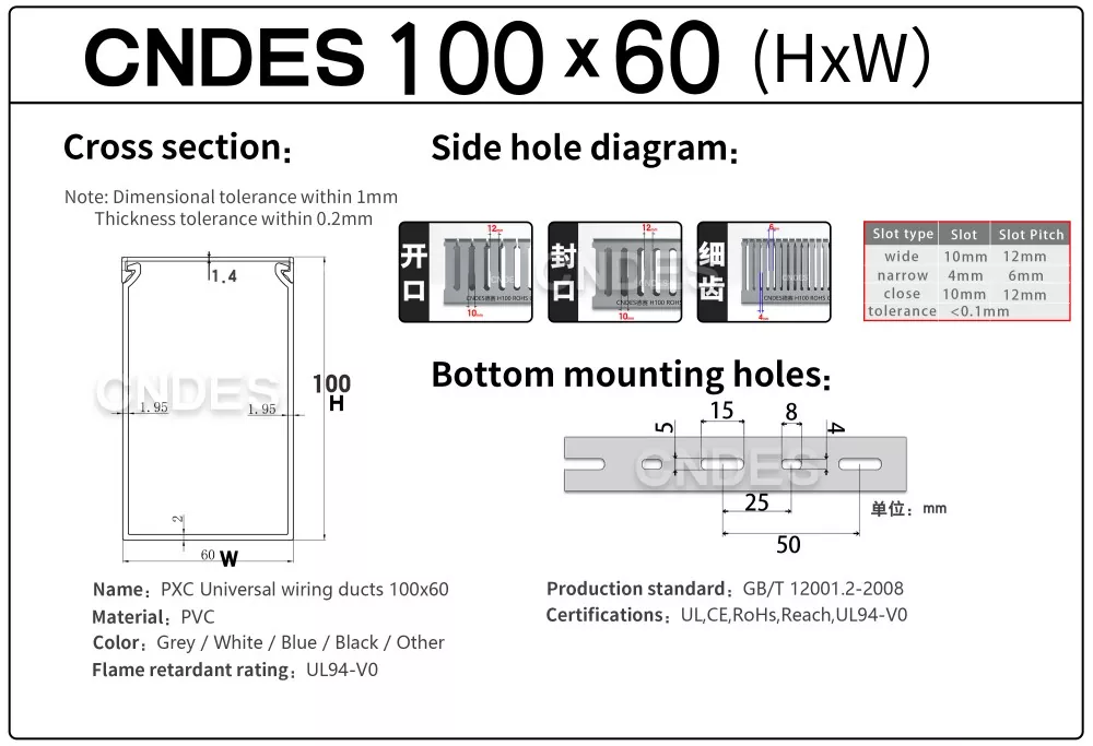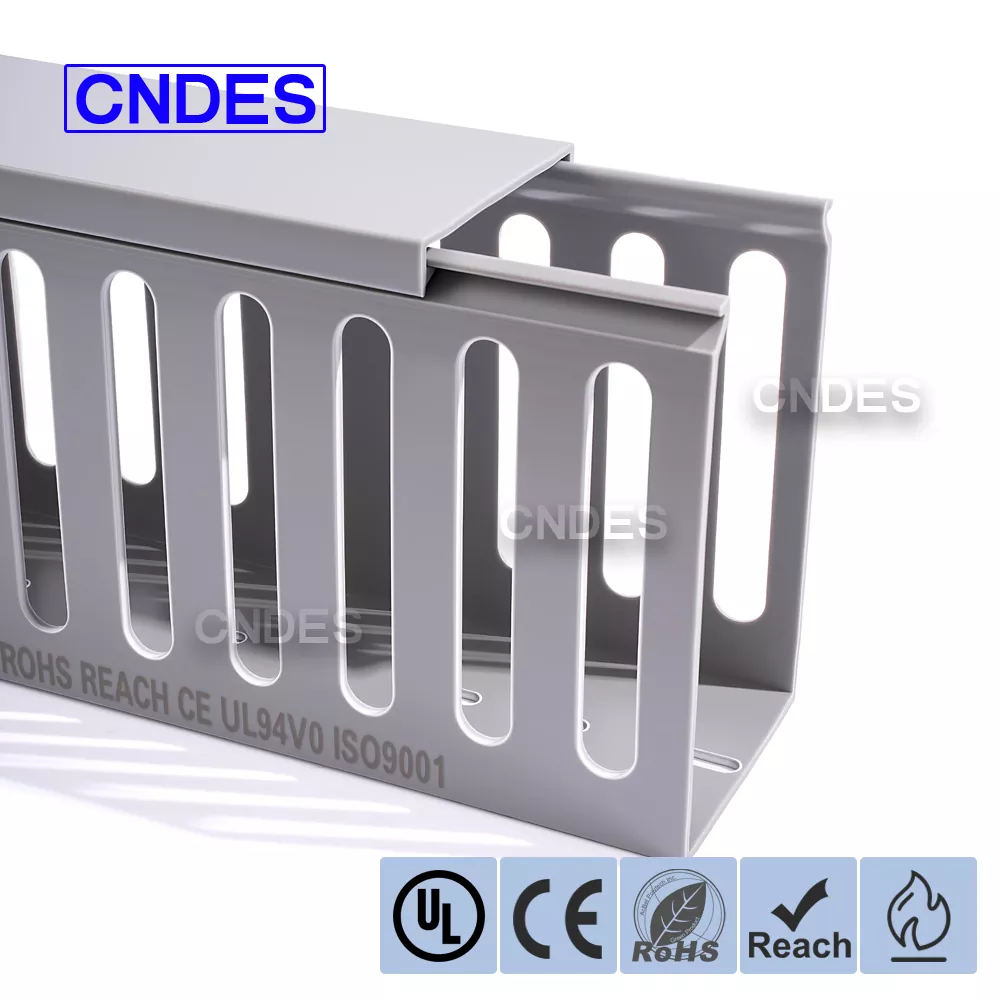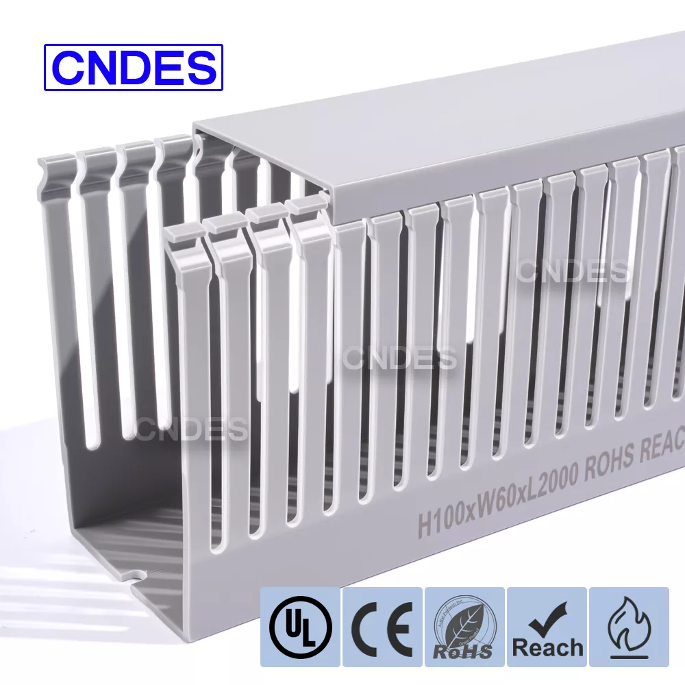 Slot Presisi- Grooving Presisi – Saluran PVC 100×60 Berkualitas Untuk Panel Listrik menampilkan desain alur yang seragam, memungkinkan kabel keluar dengan bersih dari posisi mana pun; pola lubang khusus tersedia sebagai opsi..