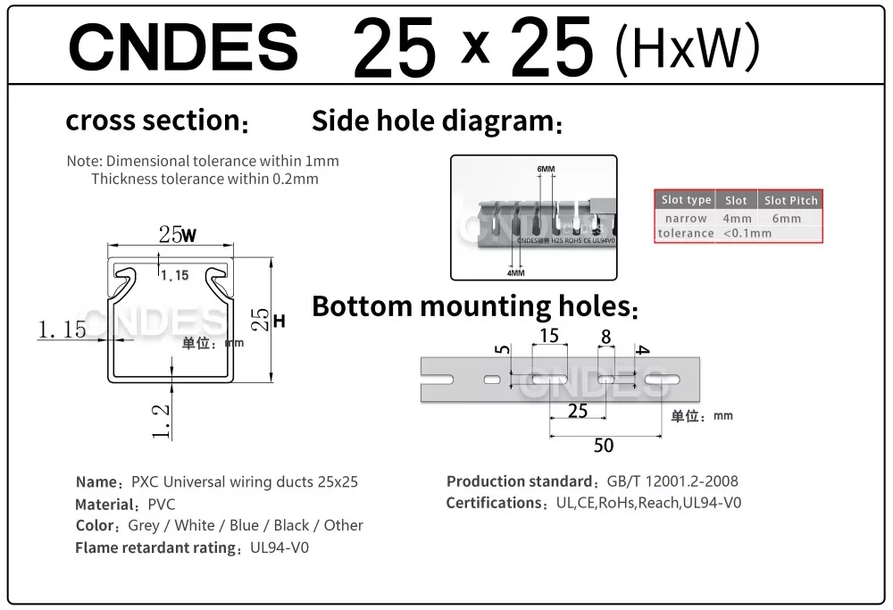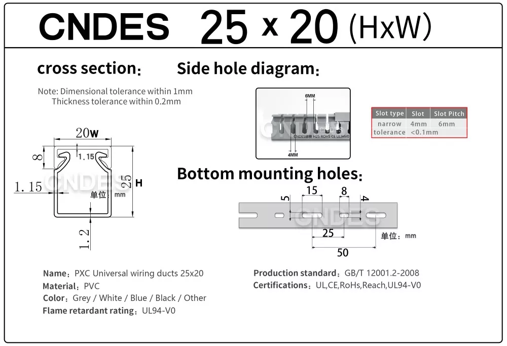 Melalui peralatan stamping presisi tinggi yang kami kembangkan secara independen, dikombinasikan dengan proses pemotongan otomatis tersegmentasi yang unik, CNDES dapat secara fleksibel memproduksi produk dalam berbagai spesifikasi, termasuk Saluran Panel Kontrol Berlubang PVC Tinggi 25mm Berkinerja Tinggi, memenuhi beragam kebutuhan pelanggan dalam lemari kontrol dan sistem kelistrikan.