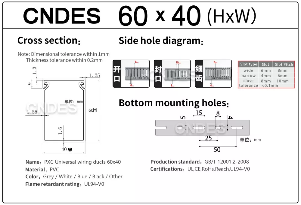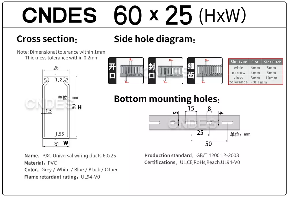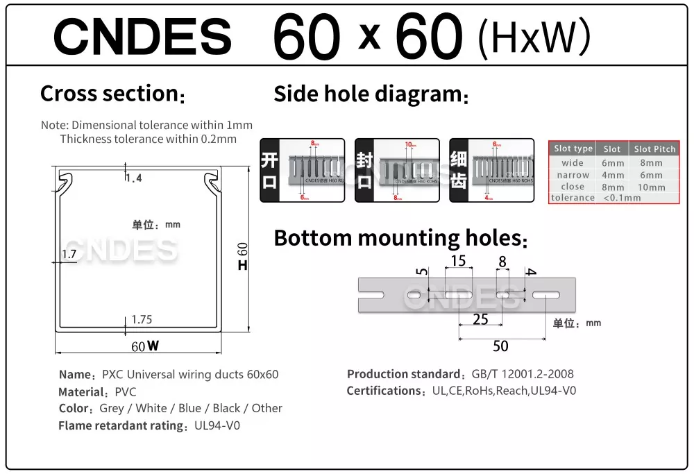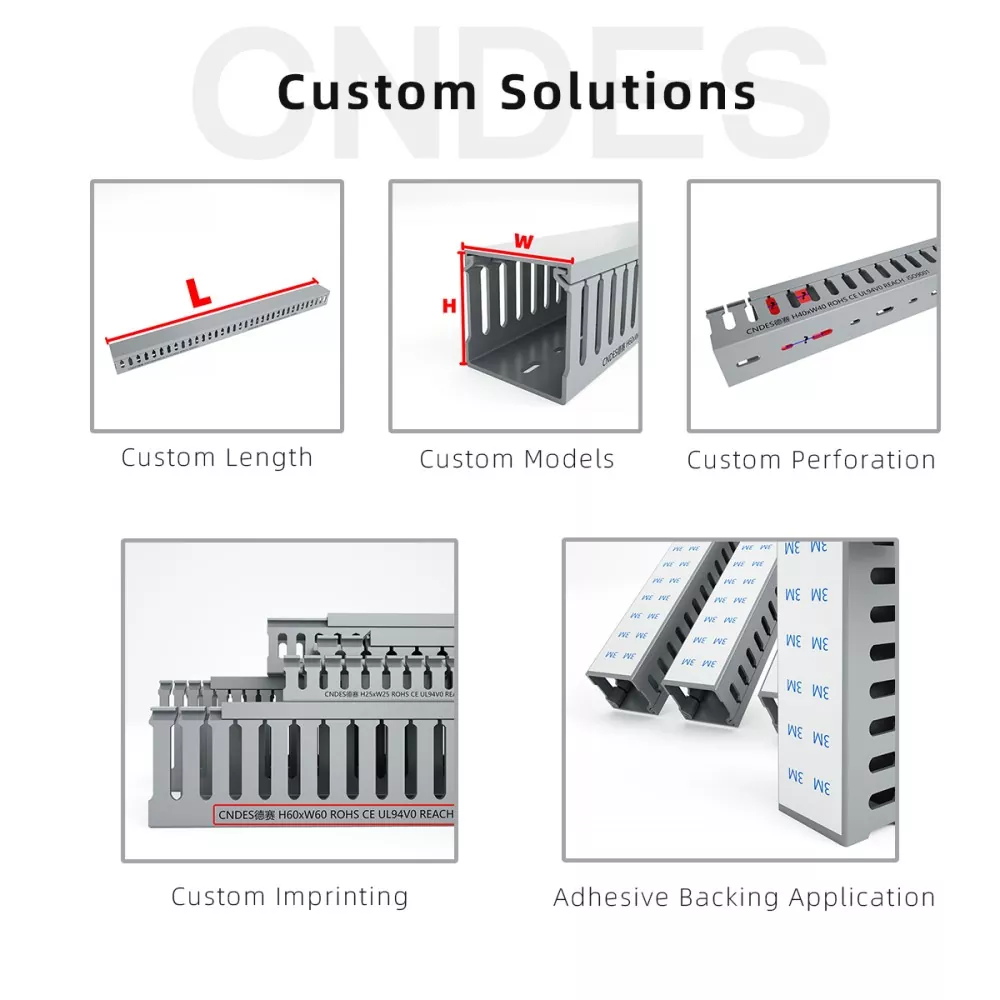 Di CNDES, kami menyediakan penyesuaian komprehensif untuk saluran kabel. Layanan kami berkisar dari fitur fungsional khusus (anti-statis, tahan UV, mudah pecah) dan penyesuaian dimensi penuh (panjang, tinggi, lebar, posisi lubang/profil/pitch) hingga opsi branding estetika (warna khusus, logo, pencetakan teks). Kami juga menawarkan dukungan perekat.