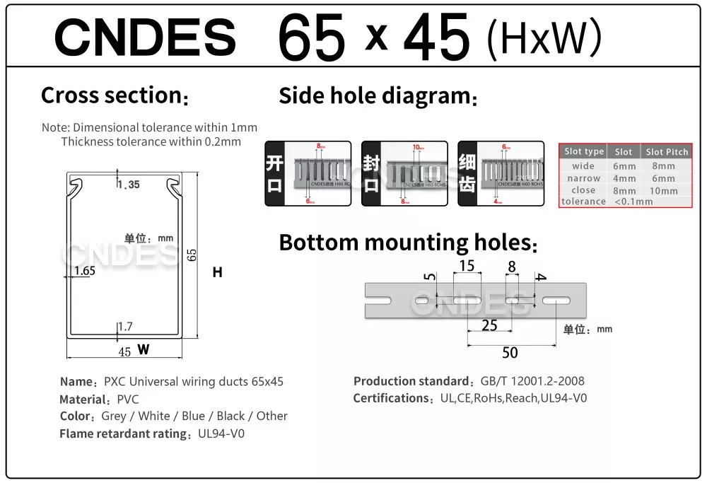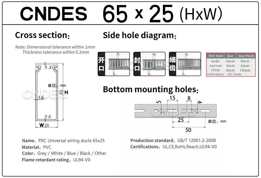 CNDES adalah pabrik sumber saluran kabel kabel PVC dengan pengalaman 24 tahun. Saluran Pengkabelan Industri PVC Berlubang Tinggi 65mm yang Disesuaikan adalah solusi ideal untuk mengatur dan melindungi kabel di lingkungan dengan kepadatan tinggi seperti panel kontrol industri, peralatan otomasi, dan instalasi mesin. Dengan tinggi 65mm, ia menawarkan ruang yang cukup untuk mengakomodasi bundel kabel yang lebih besar sekaligus memastikan perlindungan optimal dari faktor lingkungan seperti debu, kelembapan, dan kerusakan mekanis.