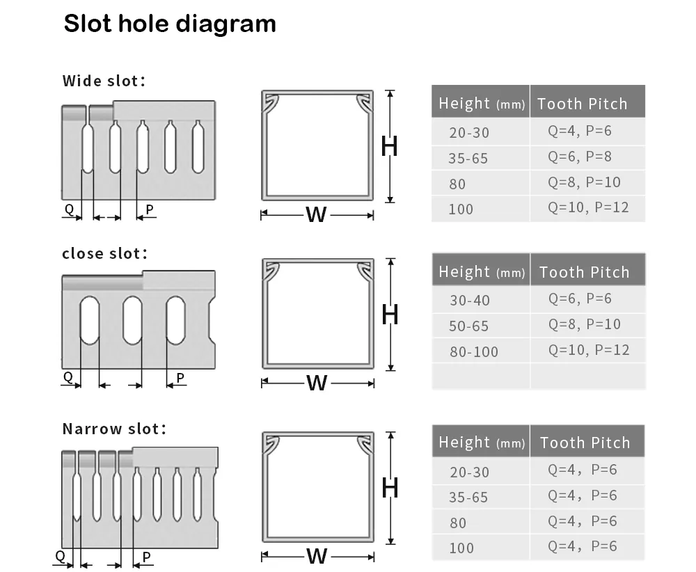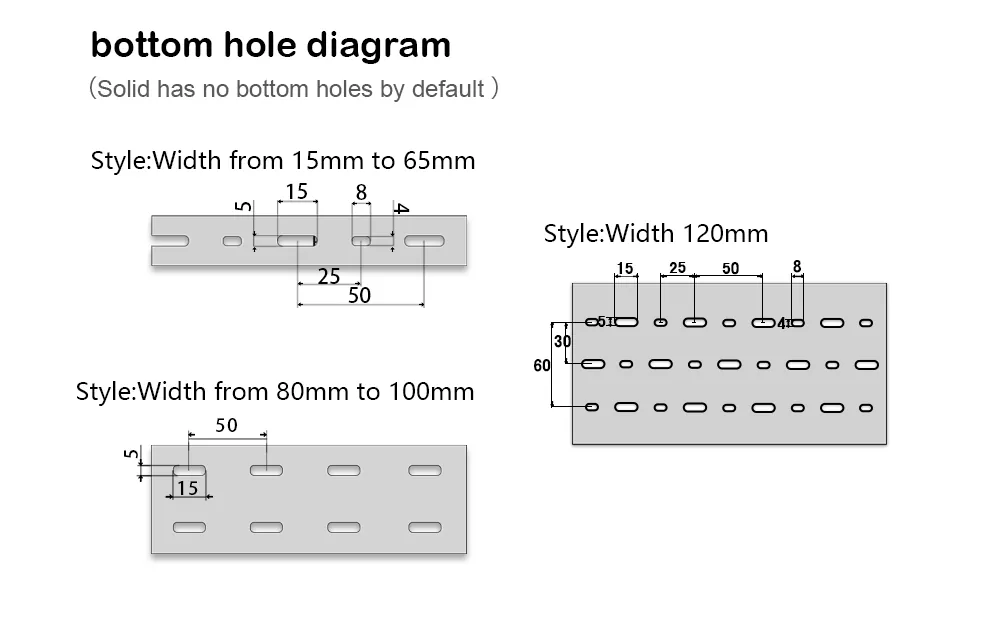 Spesifikasi baki kabel dinyatakan dalam tinggi * lebar, dengan satuan mm. Tentukan terlebih dahulu ukuran cable tray yang dibutuhkan, misalnya tinggi 80mm dan lebar 40mm. Kemudian, pilih lebar lubang outlet berdasarkan ketebalan kabel, baik gigi lebar (8mm) atau gigi halus (4mm). Disarankan agar kabel sebenarnya menempati tidak lebih dari 70% ruang baki.