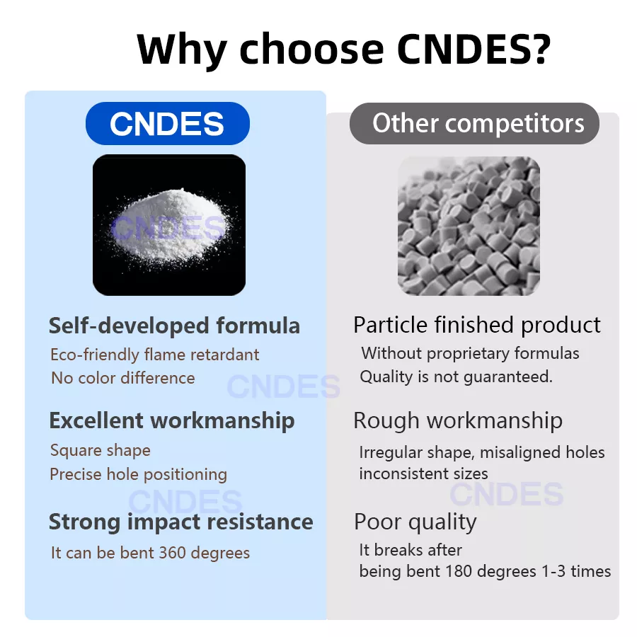 CNDES, sebagai R&D profesional dan pabrik manufaktur Saluran Pengkabelan PVC Berlubang Hitam di Cina, berspesialisasi dalam produksi massal, kontrol kualitas ISO yang ketat, dan layanan OEM/ODM. Casing hitam biasanya digunakan dalam skenario yang memerlukan kabel tersembunyi (seperti teater rumah atau kantor) atau untuk membedakan antara sirkuit fungsional yang berbeda (misalnya, saluran tegangan tinggi dan tegangan rendah), sehingga meningkatkan efisiensi manajemen.